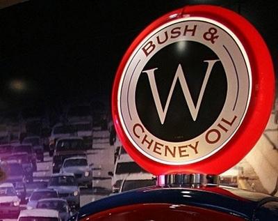 在巴士的末端還有一個汽油加油機,上面寫著:“布什切尼石油公司”。