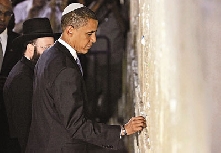 據(jù)香港《文匯報(bào)》報(bào)道,哭墻有2000年歷史,是猶太教的圣地,不少人都會(huì)把寫著禱文的紙條塞進(jìn)石縫。奧巴馬會(huì)晤以色列和巴勒斯坦自治政府的官員后,周四凌晨戴著卡巴頭飾到訪哭墻,留下紙條,之后便垂下頭,作為敬拜。