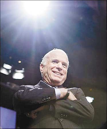 在外交和軍事政策領(lǐng)域的比拼中,古稀之年的麥凱恩顯然要比少年得志的奧巴馬老練得多。出身將門的麥凱恩可謂身經(jīng)百戰(zhàn),其作為戰(zhàn)俘在越南監(jiān)獄中度過5個春秋的傳奇經(jīng)歷更使其愛國精神無人能敵。麥凱恩一方面充分利用這些有利條件把自己塑造成美國民眾足可信賴的政治家和總司令,另一方面持續(xù)攻擊奧巴馬缺乏外交和軍事經(jīng)驗的弱點。