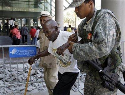 美國民衛(wèi)隊士兵幫助一名老者撤離。