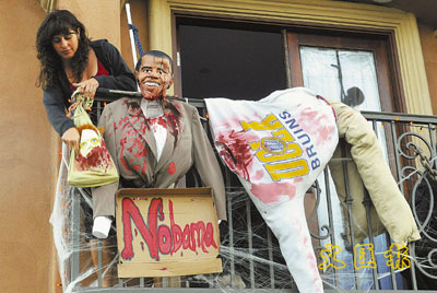 另外3宗同類事件亦有一宗發(fā)生在校園內(nèi),本月在俄勒岡州喬治福克斯大學(xué)內(nèi),4名學(xué)生因同樣在樹上吊起奧巴馬人像而被學(xué)校處分。此外,加州發(fā)生兩宗分別問吊奧巴馬和佩林像的事件,其中有名女子把奧巴馬人像吊到露臺上,更用豬肉刀插進人像的脖子中。
