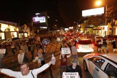 中新網(wǎng)11月6日電 綜合報道,加州數(shù)千名同性戀權(quán)利擁護者當?shù)貢r間5日走上街頭,抗議加州通過的禁止同性婚姻提案。