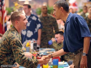 據(jù)CNN報道,正在夏威夷休假中的美國當選總統(tǒng)奧巴馬,昨天慰問了當?shù)匾缓\婈憫?zhàn)隊基地,并和駐扎在那里的士兵及士兵家屬共進圣誕晚餐。奧巴馬在美國海軍陸戰(zhàn)隊駐夏威夷瓦湖島(Oahu)的軍事基地里與士兵們一起共進了一個有火雞,烤牛肉,火腿和香腸的傳統(tǒng)的圣誕晚餐。