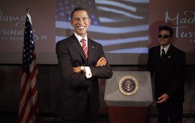 在美國紐約時(shí)代廣場的蠟像館,奧巴馬的蠟像正式與游客見面。奧巴馬的蠟像穿上深藍(lán)色西裝、配襯藍(lán)色的領(lǐng)帶及美國國旗襟章,雙手放在胸前,臉上掛有親切笑容,站在白宮總統(tǒng)辦公室布景中,造形神氣。