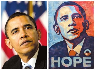 美國(guó)總統(tǒng)選舉期間,一張紅、白、藍(lán)三色相間的美國(guó)總統(tǒng)貝拉克·奧巴馬肖像廣泛傳播。圖片中,奧巴馬眼神堅(jiān)定、面部略微上仰,與圖片下方“希望”字樣呼應(yīng)。