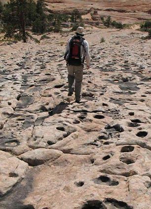 美國地質(zhì)學(xué)家在美國亞利桑那州與猶他州交界處發(fā)現(xiàn)了大片恐龍足印和恐龍尾巴拖動的痕跡。據(jù)估計,這里曾經(jīng)至少有1000只恐龍聚集?蒲腥藛T將這里形象地稱為“恐龍舞池”。