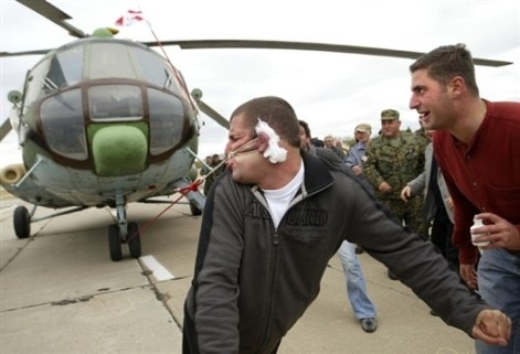 現(xiàn)年27歲的前摔跤冠軍拉沙•帕塔拉亞(Lasha Pataraya)搓了搓耳朵,在耳朵后面塞棉花,深深地吸了一口氣,開始了他的超級大挑戰(zhàn),用耳朵拉動米-8俄羅斯軍用直升機。