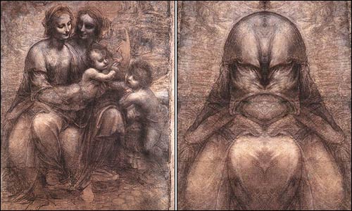 畫作“圣母子與圣安妮”中,似乎也反射出類似影像。專家說(shuō),達(dá)芬奇打算藉畫作表現(xiàn)出上帝本身,并且激發(fā)恐懼。在“施洗者約翰”畫作中也藏著另一幅圖像,。而以鏡子反射“最后的晚餐”,似乎也會(huì)發(fā)現(xiàn)圣杯倒放在桌上。