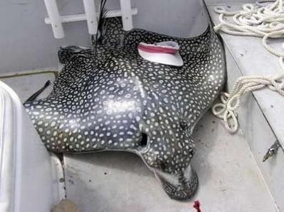 斑點黃貂魚能夠長到200多公斤,翼展能夠長到3米左右,它們偶爾會躍出水面但是攻擊性并不強,也會用它們尾部堅硬的毒鉤進(jìn)行防御。