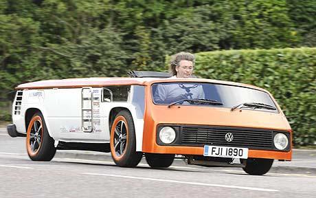 這輛露營車被命名為“敞篷蛋糕(Van-Cake)”,時速最高可達128公里/小時。桑德斯的團隊將原有大眾車1.38米高的頂棚切割掉,改裝成了一個35厘米高的頂棚。他們在車內放入新的操縱系統(tǒng)和低矮的座位。受制于空間,這輛車不是使用腳剎,取而代之的是手動剎車和變速桿;燃料槽也是經過特別制作的。目前已經取得合法上路的資格。由于這輛車非常矮,它可以輕松地從停車場柵欄下通過。