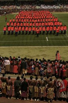 這場適逢國王40歲生日兼建國40年的“雙40”典禮,節(jié)目包括6萬佳麗的御前獻舞、打鼓表演、閱兵巡禮,以及在王太后御苑舉行的“花園派對”等。連同特別為今次活動購入、用來接載國王等嘉賓的20輛豪華車、南非訂制的大蛋糕和宰殺120頭牛。