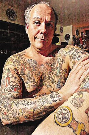 美國賓夕法尼亞州伯利恒市53歲男子喬治·賴格從8歲首次踏入迪斯尼樂園起,就與迪斯尼結下了不解之緣:他的家被裝飾成“迪斯尼風格”,屋中擺滿了26000多件迪斯尼紀念品。為了表示對迪斯尼動畫片的熱愛,賴格從18歲起就開始在身上文上各種迪斯尼動畫主角圖案,他在肚皮上文上了《木偶奇遇記》、在左肩文上了《美女與野獸》、在背部文上了《101斑點狗》……除了臉部、頸部和雙手外,賴格迄今為止在全身總共文滿了1900多個迪斯尼動畫主角圖案!