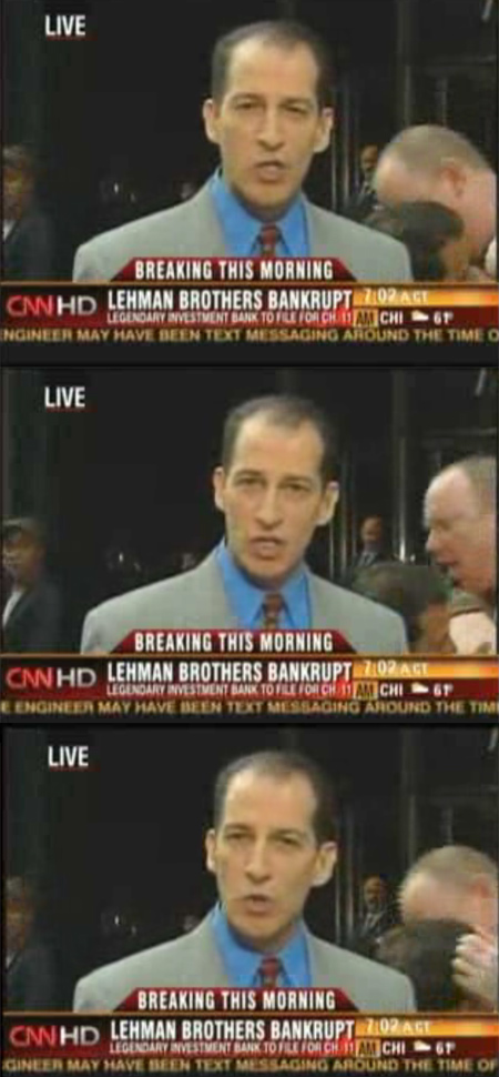 據(jù)韓國(guó)《朝鮮日?qǐng)?bào)》報(bào)道,14日凌晨(當(dāng)?shù)?美國(guó)有線電視頻道CNN以緊急新聞的形式報(bào)道了雷曼兄弟公司向法院申請(qǐng)破產(chǎn)保護(hù)的消息。該新聞是以在直播間與趕赴紐約時(shí)代廣場(chǎng)雷曼公司總部的CNN現(xiàn)場(chǎng)記者直播連線的方式播出的。
