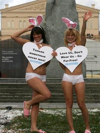 盡管莫斯科室外天氣已經(jīng)是冰雪寒天,但是善待動物組織成員打扮成兔女郎的形象,高舉“愛我們,不要穿皮草”的標語,站在寒冷的莫斯科市區(qū),擺出各種姿勢讓記者拍攝和接受采訪。
