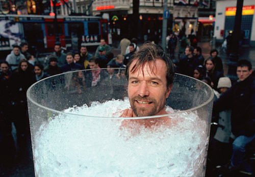 綽號(hào)“冰人”的荷蘭人威姆·霍夫因?yàn)榫哂谐5目箖瞿芰Χ劽谑。如今,他又要向新的世界紀(jì)錄發(fā)起沖擊了,12月20日,他將在德國(guó)科隆嘗試打破由他自己保持的在裝有大量冰塊的5英尺(1.52米)高的樹(shù)脂玻璃容器中半裸堅(jiān)持的最長(zhǎng)時(shí)間紀(jì)錄。