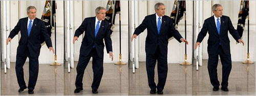 2008年3月5日,在獲得黨內(nèi)提名所需的1191張黨代表票后,美國共和黨總統(tǒng)候選人約翰·麥凱恩前往白宮,與總統(tǒng)布什共進(jìn)午餐,作為布什正式宣布支持他的前奏。但布什卻被麥凱恩晾在白宮北門等了好一會兒。早早來到白宮北門的布什左等右等麥凱恩不到,為了調(diào)節(jié)氣氛,竟然在眾位記者面前獨(dú)自跳起踢跶舞來。