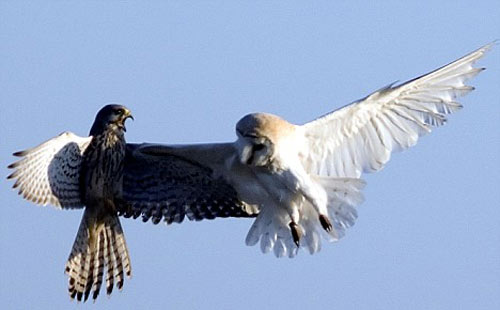 通常情況下,茶隼和貓頭鷹能夠和平相處,兩者并非天敵,而且一個在白天捕食,一個在夜間行動。茶隼攻擊貓頭鷹和貓頭鷹白天進行捕食的現象都不是正,F象。