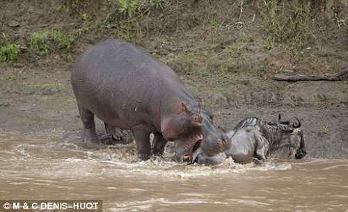 盡管那只黑尾牛羚看起來在劫難逃,不過,很顯然,它最終逃過了河馬的攻擊。攻擊事件發(fā)生在肯尼亞馬塞-馬拉國(guó)家公園的馬拉河河岸。黑尾牛羚當(dāng)時(shí)正和其它150萬只黑尾牛羚行進(jìn)在大遷徙的最后一段路程上,它們?yōu)閷ふ倚碌牟莸貜奶股D醽喅霭l(fā)前往肯尼亞。