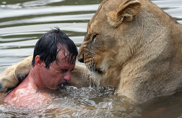 中新網(wǎng)3月13日電 據(jù)英國(guó)《每日郵報(bào)》報(bào)道,南非正值酷暑,動(dòng)物學(xué)家凱文•理查森想在Magaliesburg山南的鱷魚河里清涼一下,和他一起游泳的伙伴竟是一頭雌獅,但是他們倆之間并無血腥場(chǎng)面發(fā)生,因?yàn)樗麄兪呛门笥选?table border=0 cellspacing=0 cellpadding=0 align=left>