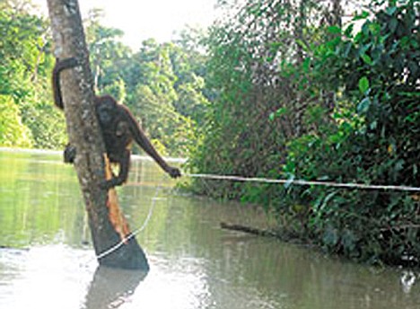 長(zhǎng)期以來(lái)人們相信大猩猩是怕水的,但是這只母猩猩根本就沒(méi)有猶豫。這只大猩猩抓住繩子,背上自己的幼兒,在水中奮力滑動(dòng),游至岸邊。在水里的時(shí)候,她始終努力保證小猩猩的頭部在水上。