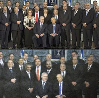據(jù)克羅地亞“網(wǎng)絡(luò)”4月6日報道,兩家猶太極端主義報紙Yated Neeman周報和Shaa Tova報將新內(nèi)閣集體合影照中的兩名女性官員——以色列新任文化和體育部長利莫爾·利夫納特女士和移民署署長Sofa Landver女士——經(jīng)過數(shù)碼技術(shù)處理,使她們在合影上“奇怪”地消失了,而站在她們位置上的變成了兩名男士。