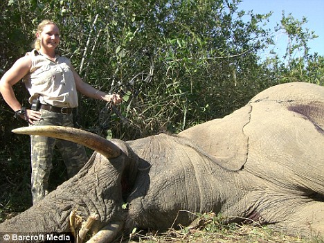 在Teressa一箭射倒大象后,并不敢馬上上前。她在旁邊守了整整一夜后才鼓足勇氣上前查看,發(fā)現(xiàn)大象確實(shí)已經(jīng)死亡。感到萬分自豪的她,拿著自己所使用的弓箭與被射殺的大象合影留念。