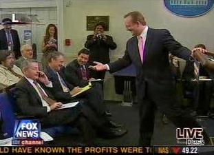 三家主要的有線電視臺都實況轉(zhuǎn)播了白宮新聞發(fā)布會!度耸隆冯s志記者約翰-吉茲的手機(jī)首先傳出鈴聲。吉布斯在聽到鈴聲后稱:“請放至震動,我們以前也是這樣作的!碑(dāng)手機(jī)再次發(fā)出聲音后,吉布斯走下講臺,要求吉茲交出手機(jī),他隨后把手機(jī)扔給站在房間后面的一位助手。就在吉布斯回到講臺,開始回答一個問題時,美國哥倫比亞廣播公司記者比爾-普朗特的手機(jī)又響了起來。已負(fù)責(zé)報道白宮事務(wù)25年的普朗特拒絕了吉布斯交出手機(jī)的要求,他離開了房間,人們發(fā)出一陣笑聲,普朗特五分鐘后回到他的前排座位。