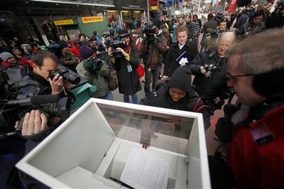 第三屆“大掃除日”(Good Riddance Day)前天在紐約時報廣場(Times Square)舉行,現(xiàn)場碎紙機轉(zhuǎn)個不停,一年來的厄運也象征性的一掃而空。