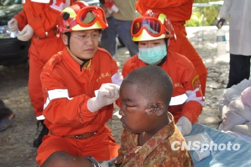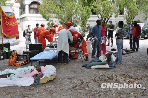 海地當(dāng)?shù)貢r(shí)間14日9時(shí),中國武警總醫(yī)院赴海地國際救援醫(yī)療分隊(duì)開設(shè)第一個(gè)流動醫(yī)療點(diǎn),已為110名受傷的災(zāi)民提供醫(yī)療救助。海地總理禮賓官趕到醫(yī)療救助點(diǎn),他握著來自中國武警總醫(yī)院的醫(yī)生的手說:“感謝中國國際救援隊(duì),你們是第一支來總理府進(jìn)行人道主義救助的救援隊(duì)”。