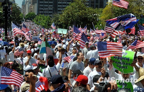 洛杉磯市墨西哥裔市長(zhǎng)維拉萊戈薩現(xiàn)身游行現(xiàn)場(chǎng),他以祖父從墨西哥移民美國(guó)的故事告訴大家追求美國(guó)夢(mèng)是每位移民的權(quán)利,他旗幟鮮明地反對(duì)亞利桑那州的新移民法,并呼吁聯(lián)邦政府加快移民改革步伐。美國(guó)國(guó)會(huì)華裔眾議員趙美心向數(shù)萬民眾發(fā)表演說,“我們現(xiàn)在就要全面的移民改革!”趙美心等國(guó)會(huì)議員最近發(fā)起推動(dòng)的一項(xiàng)移民議案得到了絕大多數(shù)拉丁裔移民家庭的擁護(hù)。