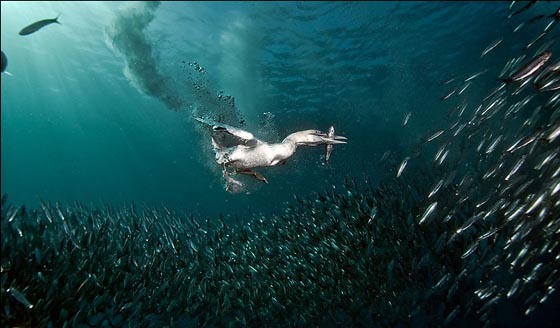 這群從南非海域向更暖和的印度洋遷徙的沙丁魚(yú)不僅要面對(duì)能以每小時(shí)40海里行進(jìn)的鯊魚(yú)和海豚的追逐,還要防止陰險(xiǎn)的塘鵝從空中的偷襲。