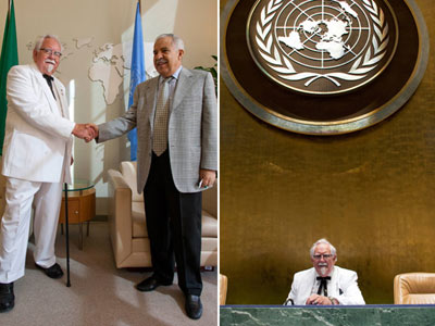 這位名叫湯普森的男子一頭白發(fā),戴著眼鏡,身穿肯德基創(chuàng)始人桑德斯上校標志性的白色西裝,打著黑色領結(jié),不知為何成功避開了嚴密的安保措施,混進位于美國紐約的聯(lián)合國總部大樓。他提出與聯(lián)合國大會新任主席、利比亞前外長阿里.圖里基握手合影,得到了對方回應。湯普森還成功地在聯(lián)大主會堂的聯(lián)合國徽標下拍了多張照片,從照片上看,好像在開會。