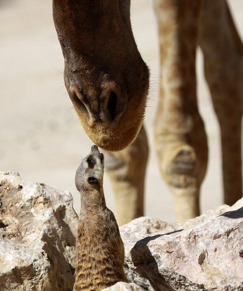 中新網(wǎng)2月22日電 據(jù)臺灣“今日新聞”22日援引英媒報道,看過動物星球頻道的《狐獴大宅門》嗎?這里有該頻道沒辦法拍到的畫面──攝影師阿方索帕茲(Alfonso Paz)在葡萄牙里斯本動物園直擊,一只厚臉皮的狐獴(又稱貓鼬),竟主動向長頸鹿索吻!逗趣的一瞬間也被拍了下來。