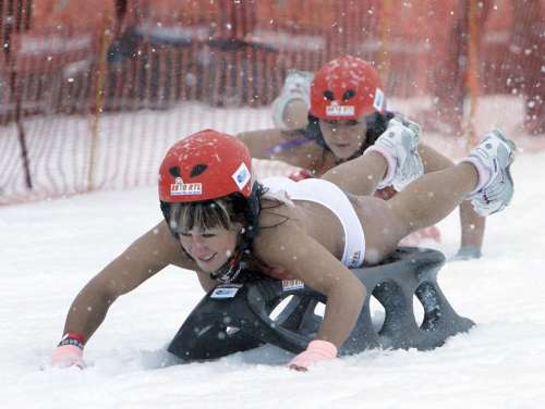 這場上空雪橇錦標賽吸引了30名年輕男女參賽,其中不乏前凸后翹的性感辣妹與身材壯碩的猛男。