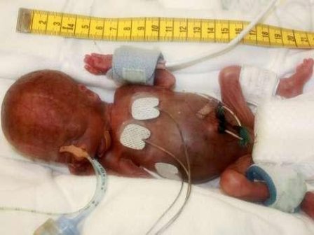 這名男嬰于2009年6月出生,比預產(chǎn)期提前了15周。當時他在母親體內(nèi)有危險,醫(yī)生立即實施了剖腹產(chǎn)。出生時男嬰極其纖弱,大小和一張A4紙差不多,體重只有275克,輕得像一塊黃油。醫(yī)生不得不把他放在保育箱里,但是仍然不能保證其成活。經(jīng)過6個月的精心護理,2009年12月,這名男嬰體重增加到3.7公斤,和一名足月的新生兒差不多大小,順利出院。