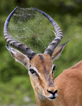 所羅門說(shuō),羚羊肯定是在公園里游逛時(shí),無(wú)意之中兩角掛到了懸在某處的蜘蛛網(wǎng),并將網(wǎng)和蜘蛛一同載走,一直掛在角上。