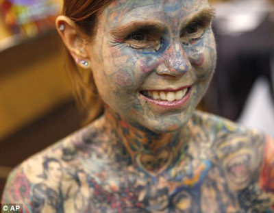 希努斯又被人們叫作“插圖女”。她身上的圖案類型豐富,有叢林景色,還有她最喜歡的演員的肖像畫。起初,希努斯開始紋身是因為她患有先天性的卟啉病,一見太陽皮膚就會發(fā)皰、留疤。她紋身后雖然病情沒有好轉,但是這些紋身蓋住了身上的傷疤,她也可以暴露在太陽下了。后來,隨著紋身面積不斷擴大,她深陷其中不能自拔。在博覽會上她提到她所有的紋身都是同一位大師的杰作。