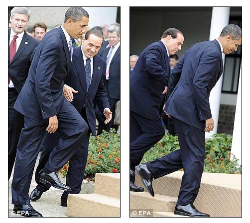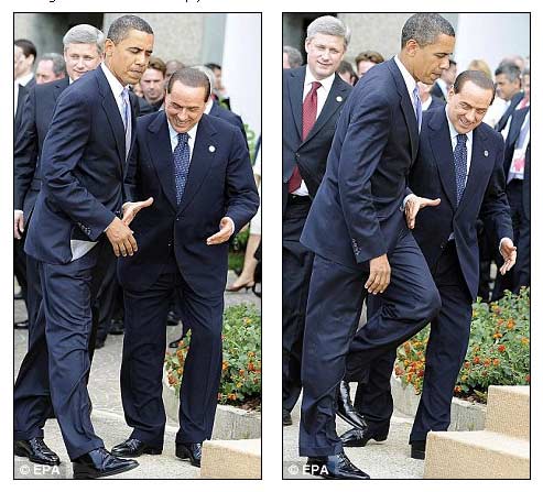 據(jù)英國(guó)《每日郵報(bào)》7月9日?qǐng)?bào)道,作為G8峰會(huì)上的重量級(jí)人物,奧巴馬的到來(lái)讓意大利總理貝盧斯科尼喜出望外。然而這次貝氏可謂是“熱臉貼上了冷屁股”,他滿臉堆笑地伸出手,要和奧巴馬握手,但對(duì)方卻對(duì)他“視而不見(jiàn)”,直接從他前面走過(guò)。