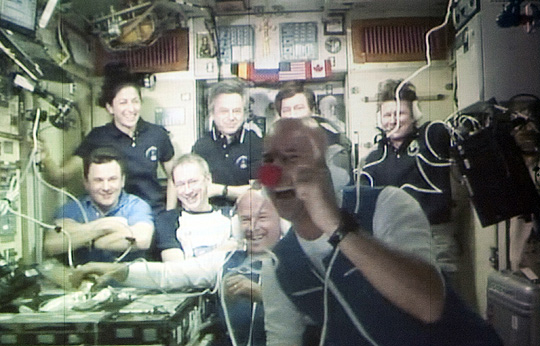 此次在國際空間站逗留、觀光期間,拉利伯特干起雜技演員老本行,戴上小丑鼻子道具,在零重力狀態(tài)下與自己的孩子們進(jìn)行視頻通話。此外,他還完成了一項(xiàng)特殊使命──在國際空間站與地面舉行了“地空聯(lián)機(jī)”,呼吁公眾關(guān)注水資源問題。