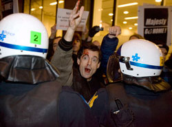 示威人群揮舞著鳶尾花旗(fleur-de-lis,波旁王朝復(fù)辟時(shí),王室使用的旗幟),大喊口號(hào),扔雞蛋抗議。有的示威者坐在街道中間,導(dǎo)致查爾斯原定參加的出席儀式被迫取消。