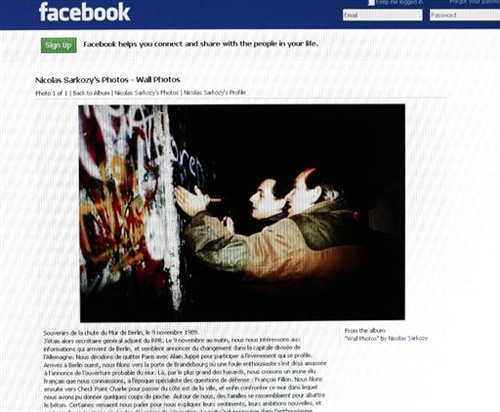前幾天,薩科齊在社交網站facebook上發(fā)布了一張舊照片,顯示他正在鑿柏林墻,聲稱自己于1989年11月9日用鐵鎬見證了柏林墻的倒塌。