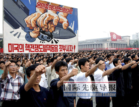 今年的6月25日是朝鮮戰(zhàn)爭爆發(fā)59周年紀念日,也是朝鮮的“反美斗爭日”。前兩年,朝鮮在平壤體育館舉行規(guī)模相對較小的“反美斗爭日”群眾大會,而今年則改在金日成廣場舉行,參加大會的人數(shù)達到10萬名!秶H先驅(qū)導(dǎo)報》記者應(yīng)邀參加了這次大會。偌大的廣場上紅旗招展,人頭攢動!跋麥绯r人民的不共戴天的敵人——美帝侵略者”、“趕走美帝,統(tǒng)一祖國”、“在反美大決戰(zhàn)中顯示英雄的朝鮮人民的本色”等標語和宣傳畫隨處可見。