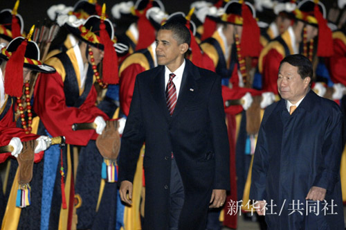奧巴馬的訪韓行程緊湊,抵達(dá)烏山美國空軍基地之后,19日上午和李明博會談,下午巡視探訪駐韓美軍之后,隨即返美。