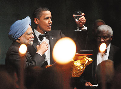 中新網(wǎng)11月26日電 據(jù)香港《文匯報(bào)》報(bào)道,美國(guó)總統(tǒng)奧巴馬24日晚在白宮南草坪首設(shè)國(guó)宴,高規(guī)格接待正在華盛頓進(jìn)行國(guó)事訪問(wèn)的印度總理辛格,這是奧巴馬上任后第一次以國(guó)宴規(guī)格款待來(lái)賓,從環(huán)境布置到菜譜,處處顯出印度特色,凸顯美國(guó)對(duì)南亞伙伴的高度重視,但在失業(yè)率高企之際舉行盛宴亦受到抨擊。