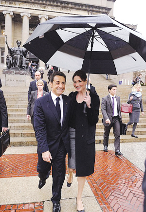 法國娛樂雜志的網(wǎng)站用頭條報道薩科齊夫婦到訪紐約,紐約給了薩科齊在自己的國家,也好久沒有感受到的關注,哥倫比亞大學學生的熱情,更讓薩科齊心情大好,他放棄事先準備好的講稿,改說肺腑之言。從薩科齊在哥倫比亞大學演講的安排,就可以看得出來法國人是多么注重外在美。薩科齊在哥倫比亞演講的白色講臺和通往講臺的淺灰色地毯,都是他自己從法國帶去的。薩科齊穿深藍西裝、打黑領帶,布呂尼穿黑上衣、配灰裙子,加上黑白相間的花傘,看得出來是經(jīng)過刻意搭配,和地毯與講臺呼應。