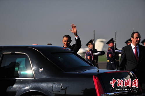 奧巴馬總統(tǒng)于當(dāng)?shù)貢r(shí)間8日上午9時(shí)30分(北京時(shí)間8日15時(shí)30分)步下降落在布拉格魯濟(jì)涅老機(jī)場(chǎng)的“空軍一號(hào)”專(zhuān)機(jī)舷梯。簽字儀式在兩個(gè)半小時(shí)后舉行。
