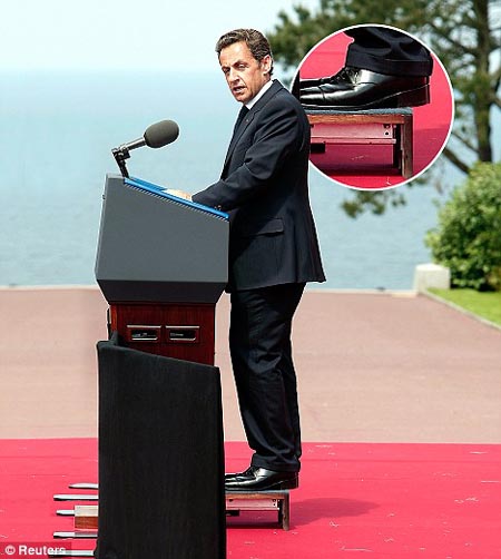 在發(fā)表諾曼底登陸65周年的紀(jì)念演講時(shí),為讓自己站得更高,確保自己在電視畫面中的身高不輸給同時(shí)與會的美國總統(tǒng)奧巴馬和英國首相布朗,薩科齊命令工作人員在講臺上放置了一個(gè)高約6英寸的小板凳,站在上面,薩科齊顯得真的高挑了許多。