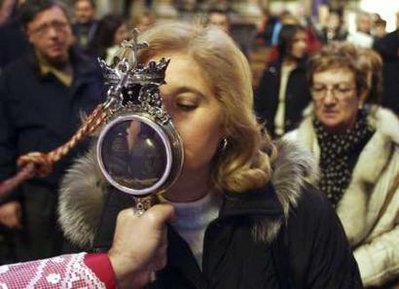 上周,一名51歲的男子因感染甲流,在那不勒斯醫(yī)院不治身亡,成為意大利第一例甲流致死病例。由此,周一,天主教那不勒斯教會(huì)與城市當(dāng)局共同決定,為預(yù)防甲流病毒大規(guī)模傳播,將禁止信徒在本月晚些時(shí)候開始的宗教節(jié)日上親吻裝有圣人血液的玻璃小瓶。從9月19日開始,這樽裝有天主教圣人圣亞努阿里烏斯血液的玻璃瓶將在那不勒斯市的主教座堂展出一周,展覽期間,無論前來膜拜的信徒有多么虔誠(chéng),也不能用嘴親吻瓶子,只能用額頭輕觸瓶子。