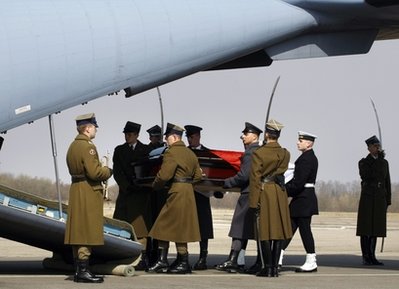 在裝有卡欽斯基遺體的靈柩被送入機艙時,波蘭和俄羅斯的儀仗隊舉行了簡短而莊重的紀念儀式。
