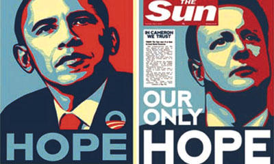 中新網(wǎng)5月7日電 據(jù)香港《文匯報(bào)》報(bào)道,英國(guó)《太陽報(bào)》6日仿照奧巴馬2008年競(jìng)選海報(bào)設(shè)計(jì),推出支持保守黨黨魁卡梅倫的版面。